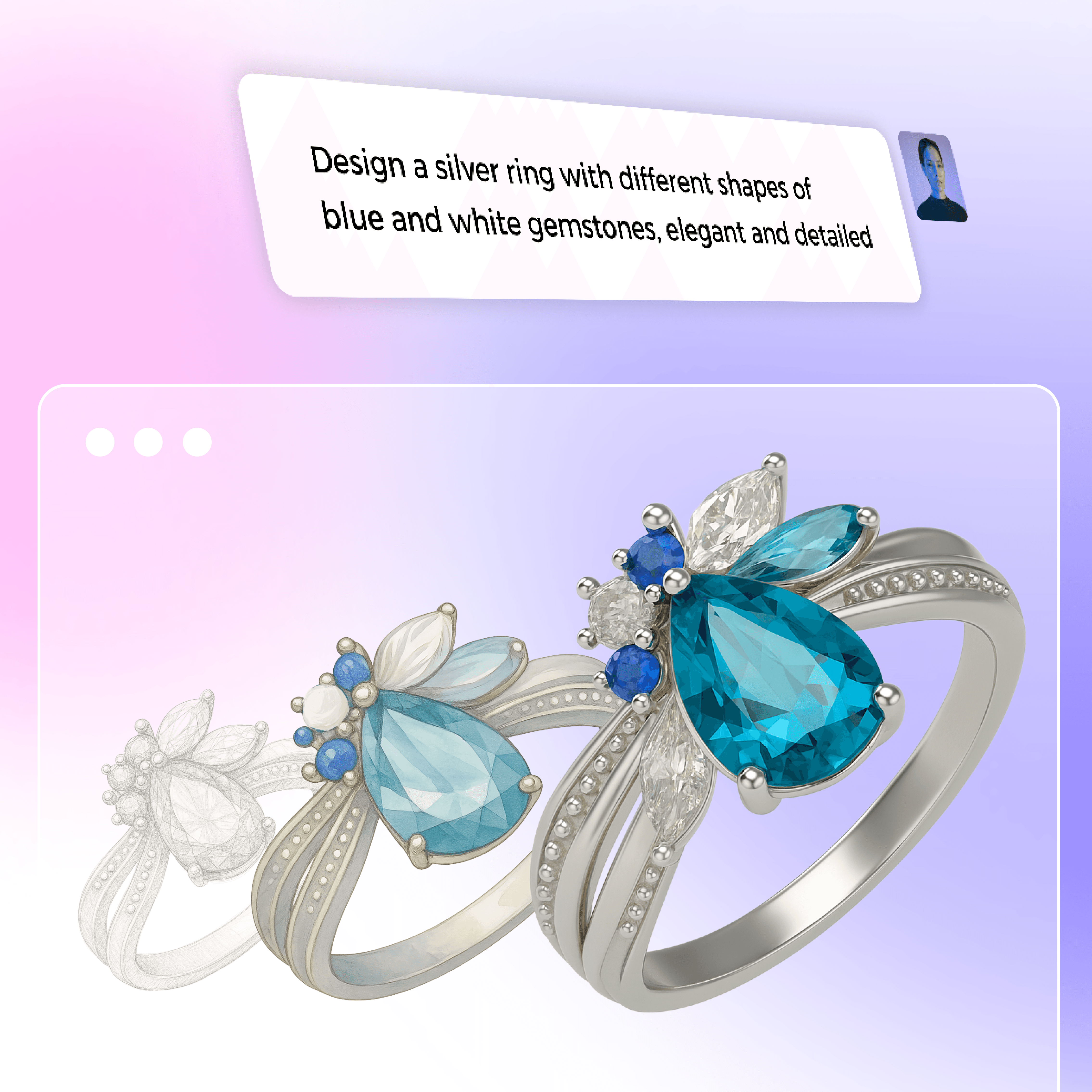 Tell Skyveil who it’s for and what they love — it turns your ideas and sketches into polished design options and guides you to a finished 3D piece without any design experience.
